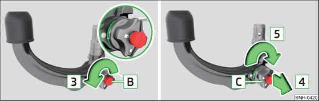 - Estrarre la testa sferica in direzione della freccia 3 verso il basso dal pozzetto di alloggiamento. Al tempo stesso la testa sferica si innesterà nella predisposizione e sarà quindi pronta a essere nuovamente inserita.