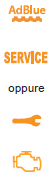 | Lampeggiante, abbinata alla spia SERVICE, accompagnata da un segnale sonoro e da un messaggio indicante l'impossibilità di avviare il moto | Il serbatoio dell'additivo AdBlue® è vuoto: il dispositivo antiavviamento regolamentare impedisce il riavviamento del motore. | Per poter riavviare il motore, occorre effettuare tassativamente